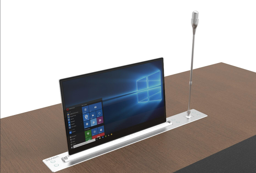 The SEADA FG-DB Series Motorised Retractable Monitors and microphones are state of the art exquisite monitors that are made from aluminum. To ensure the finest ergonomics and the best viewing angle it has a vertical motorised movement that can be tilted from 0°to 45°. FG-DB series comes in three different sizes of 15’’,17’’ and 22’’ to satisfy different users’ need. This system can be used as a standalone unit in class rooms, offices, receptions etc. In addition, it can operate as a multi units’ system with the SEADA built-in DB paperless conference system. The DB system enables participants to share their onscreen content with the rest of room via a single button pressing When it is not in use, the monitor and microphone can be retracted into the housing beneath the desk. This makes the desk surface tidy as well as putting the monitor in a safe and secure location.
