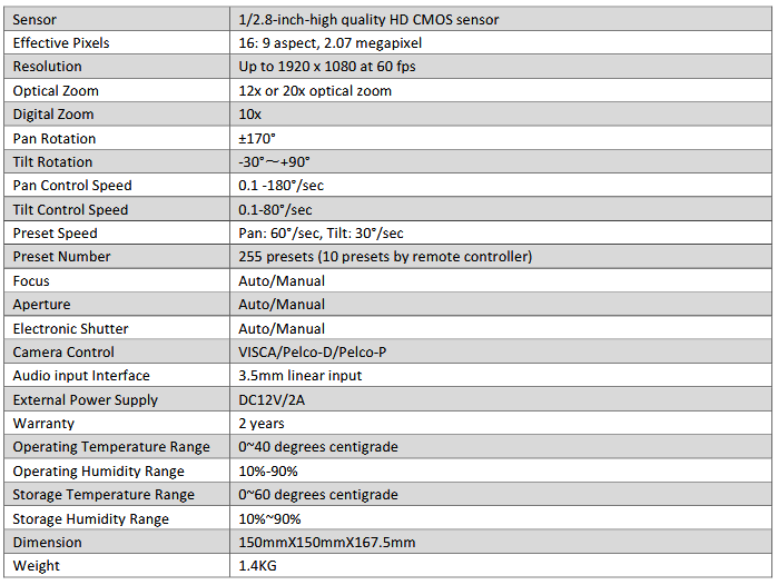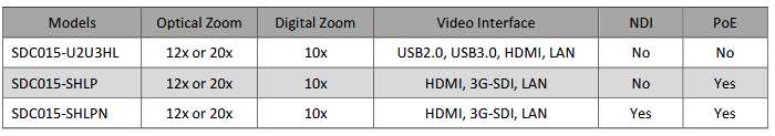 SDC015 Series PTZ cameras deliver HD video output with excellent sharpness and smoothness, accurately reproducing every detail, colour and therefore awarding users a vivid video experience. SDC015 cameras apply H.265/H.264 encoding protocols which not only guarantee the motion video with fluent and sharp quality but also small bandwidth requirement. SDC015 Series PTZ cameras come with different models with different video interfaces (USB, HDMI, SDI, LAN) for video outputs making them ideal for applications of Videoconferencing, Webcasting, Lecture capture, Tele-training, Tele- medicine, Security and so on.